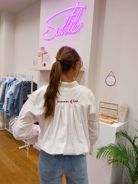 Pasvorm: Heel mooi hemdje met geborduurde tekst ‘ summer of love’ en details aan de mouwen. Valt iets korter.